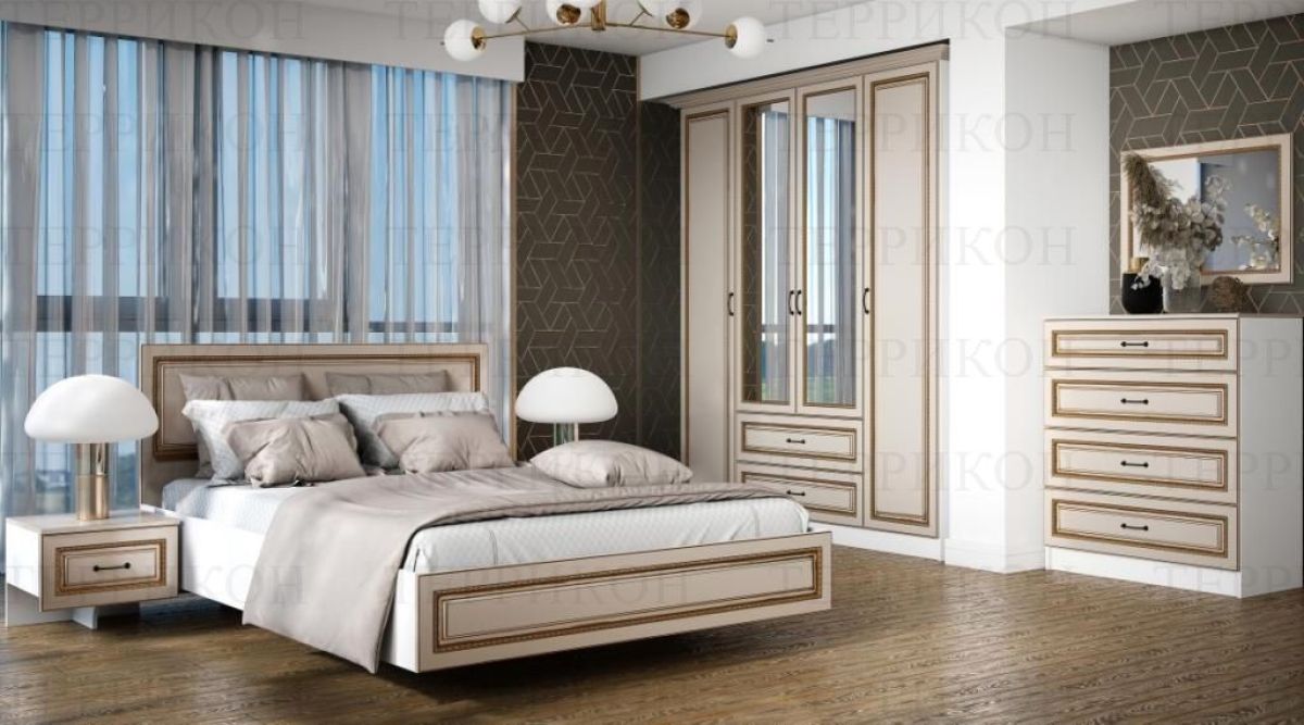 Интернет-магазин "Мебель 24" рад предложить Модульная спальня Женева (ЛДСП белый/МДФ софт светлый с патиной золото) по привлекательной цене, от производителя Террикон.